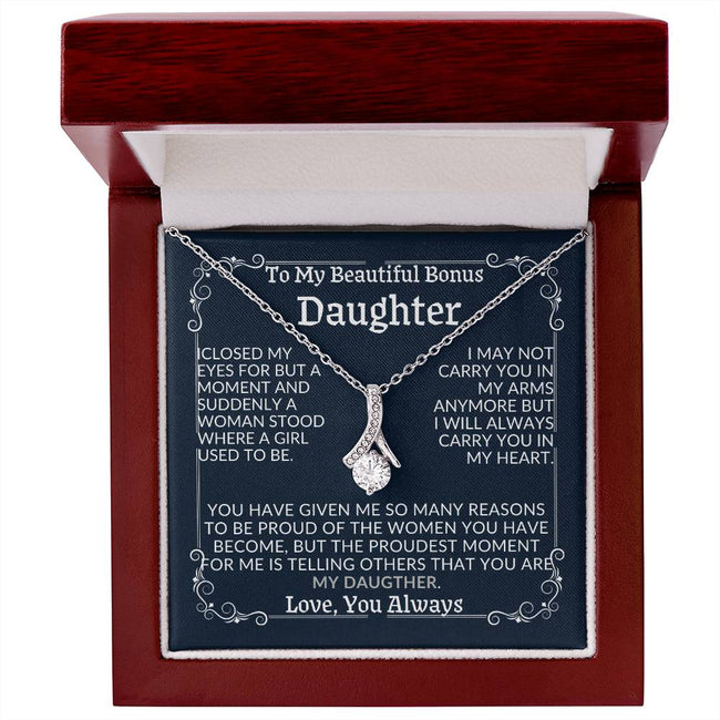 Show your bonus daughter how much she means to you with our To My Beautiful Bonus Daughter necklace. "U Forever Loved" with a love knot pendant, this heartfelt piece will remind her of your unconditional love every day. A perfect gift to strengthen your bond. gift from Dad to Bonus Daughter & from Mom to Bonus Daughter Gift for Anniversary Birthday gift Christmas Wedding gift or Valentine Day Mother's Day or I Sorry gift any occasion} ❤️⭐⭐⭐⭐⭐