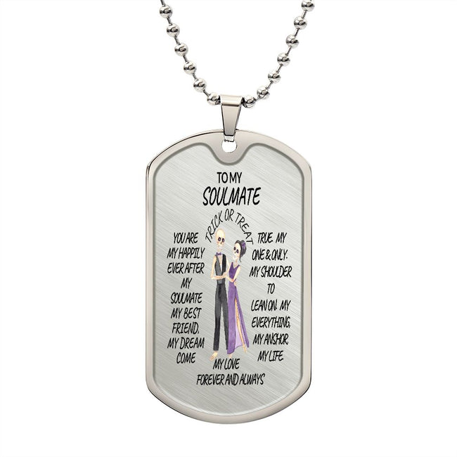 Trick or treat? No matter the answer, you'll always have a reminder of your lovely soulmate with this Trick or Treats-themed dog tag! Perfect for Halloween lovers, this fun and quirky tag will make sure you never forget your special someone.