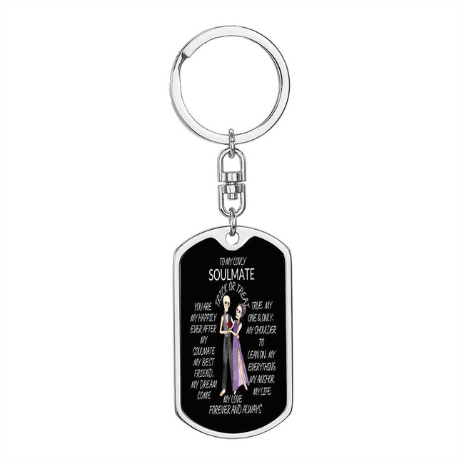Show your love this spooky season with the To My Lovely Soulmate-Trick Treat-Forever-Dog Tag Keychain! Perfect for Halloween, this quirky keychain will keep your Halloween spirit alive all year long! With its unique charms and dog tag design, this keychain is sure to become a forever keepsake. Trick your soulmate with a treat they'll remember forever!